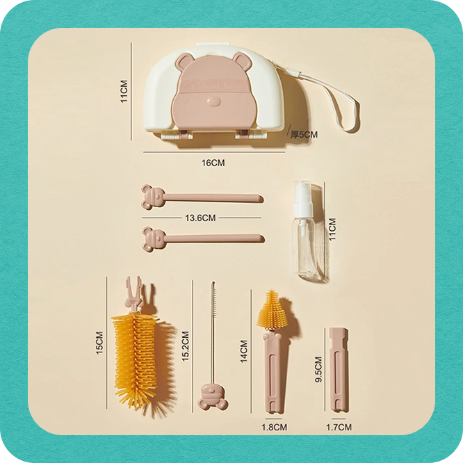 Kompletny silikonowy zestaw 8 w 1 do czyszczenia butelek, smoczków i akcesoriów dziecięcych – zawsze pod ręką, dzięki poręcznemu etui.